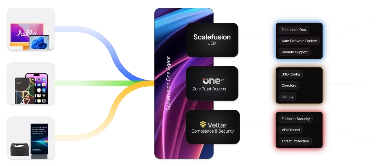 Scalefusion brings endpoint and access management together. With built-in support for SSO for your apps & devices, endpoint authentication and conditional access tied to UEM compliance, Scalefusion lets you manage endpoints, secure logins, apps, and data—right from the point of device trust.